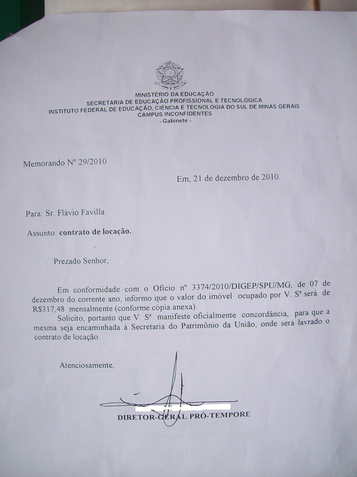 6...... Denunciada está a denominada “morada da indignidade” a espera da intervenção saneadora das autoridades. Pois na instituição administrativamente corrompida, ao fim corrompe-se a educação circundante; pois didaticamente se ensina e dissemina perversão. Pois se ensina ser “lícito” diretor chamar funcionário subordinado ao gabinete – vinculado por laço familiar. E se ensina torná-lo portador de mensagem, carta de chantagem a membro do Conselho Superior (Memo. 029/2010) para tudo mais calar sob silêncio temeroso. E mais vicejar corrupção às sombras. E para tanto, se comete aula explícita de estelionato: forja-se documento e produz-se extorsão sob grave ameaça a subordinado. Pois covardia e indignidade irradiante, maior (exemplar, administrativa) maior não poderia haver. Pois eis, registrado (B.O. 08/2010 – DPC Inconfidentes, 17/01/2011) como fato ocorrido em sala, onde mais se exige respeito e dignidade: o gabinete de diretor geral. Exatamente, próprio educacional da União, situado à Praça Tiradentes, 416 –Inconfidentes, MG. Pois eis como “morada da indignidade” a assinatura confessa, expressa em ata. E próprio diretor evidencia a corrupção e exacerbação de poder jamais alcançada. Pois ao comprometer a SPU/MG (Of. 3374/DIGEP/SPU/MG) conformou atribuições - entre funções específicas. Inépcia técnica à parte ao lado da última maldade em termos de extorsão considerada em “valores de aluguel” a esse título estampado, comprova existência de quadrilha para dar curso à perversidade criminosa. E evidencia caminhos subalternos a serem esclarecidos. Ao fim, denunciados estão: falsos educadores assomam poder. Acobertam-se. Ajustam-se por editais; fixam suas próprias leis: expressam vontade, falsidade e poder ao talante da imaginação – virtual desconhecedora da própria legislação. E concretamente emitem documentos falsos. E a tudo, esperavam-se acobertados. Inclusive pela assessoria prestada às custas da AGU em lastimáveis feitos; via de regra, sempre ao início destinados a atemorizar recalcitrantes. Tais documentos estão disponíveis como ementas para a devida correção pela corregedoria daquela entidade.